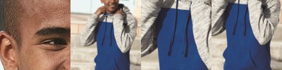 4.9 oz. 65/35 cotton/polyester; Solid jersey body; Raglan sleeves; Pouch pockets; Hem cuffs and bottom; Drawstring hood;