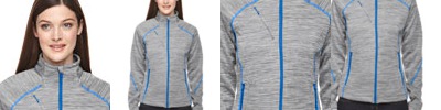 100% polyester mélange jersey bonded with 100%; polyester microfleece, 7.4 oz./yd2/252 gsm; inside storm placket with chin guard; contrast center front reverse coil zipper ; stretch storm cuffs with thumb holes; chest pocket with contrast invisible zipper; lower pockets with contrast reverse coil zippers; contrast coverstitch details; audio port access through inside left pocket; adjustable shockcord at hem;